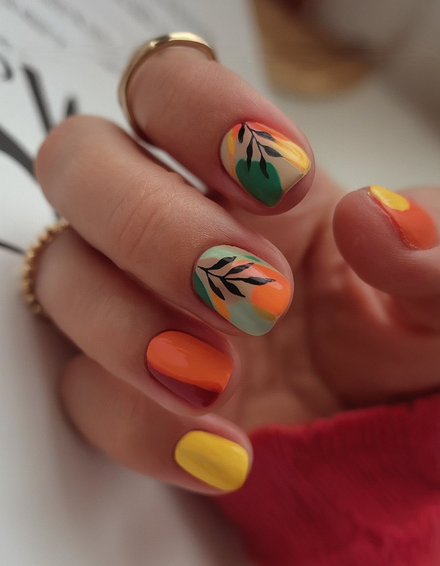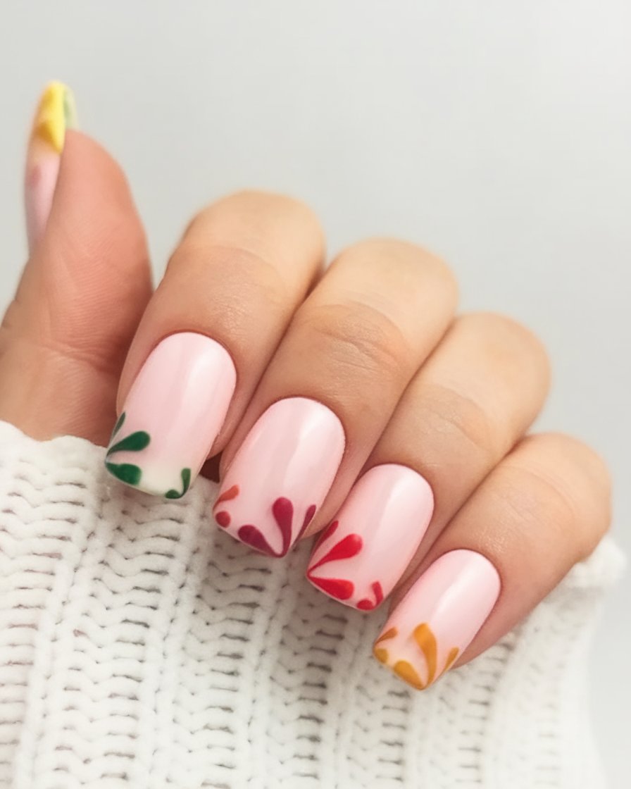 Doesn t this look like the best combination of summery elation and the freshness of autumn? Colour bursts forth out of each nail like confetti on a soft pink tray, green, burgundy, orange, the precise moment the leaves are beginning to change yet you still have on your favorite sandals.