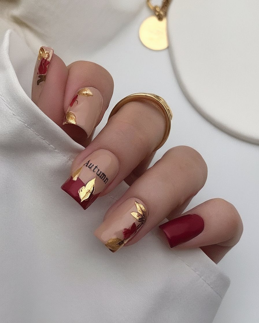 Bright red and nude French tips are upgraded to use fine gold leaf and even the word autumn is discretely written in. It is elegant and innovative that is, a manicure that begs people to compliment it wherever you appear.
