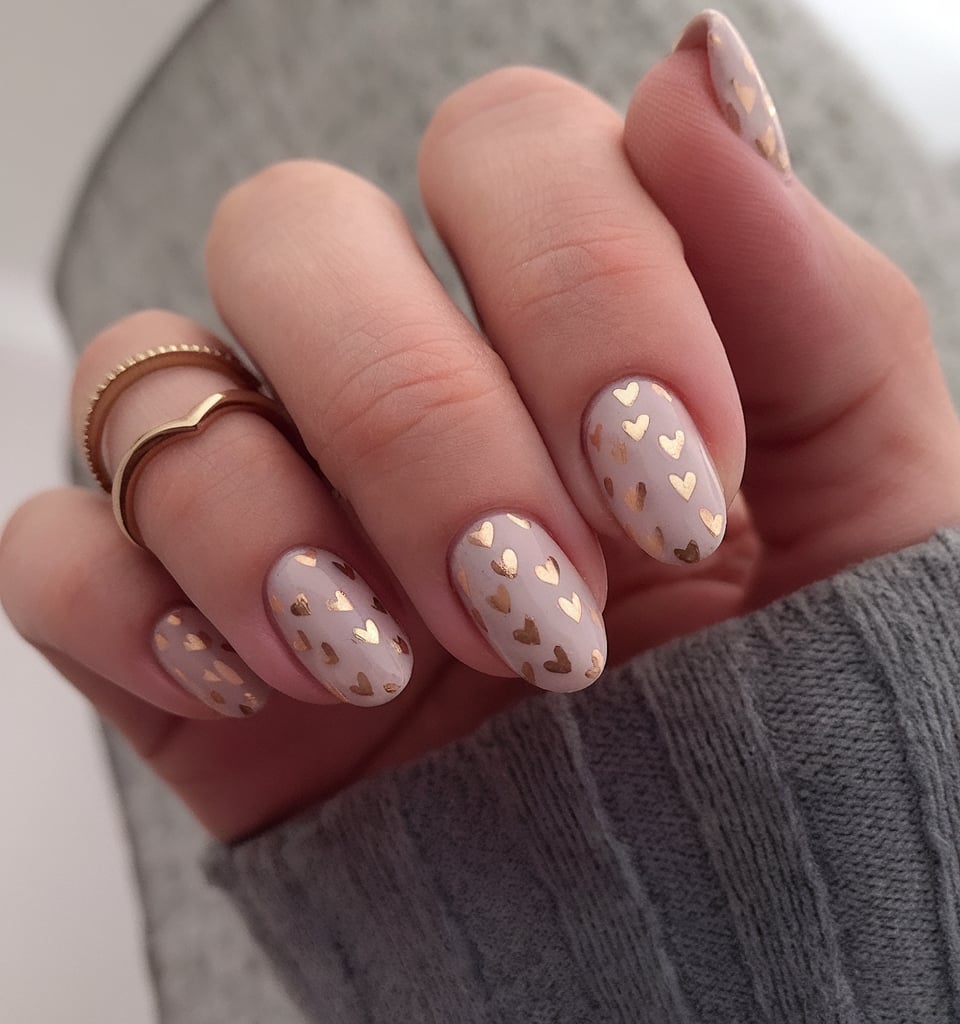 The tiny gold hearts on a nail with a blush tone are very feminine and soft; they look like some sort of secret you wear with you. It has a little flirtiness, but it is not excessive, it is a hint of a naughty perfume that no one except you knows about.