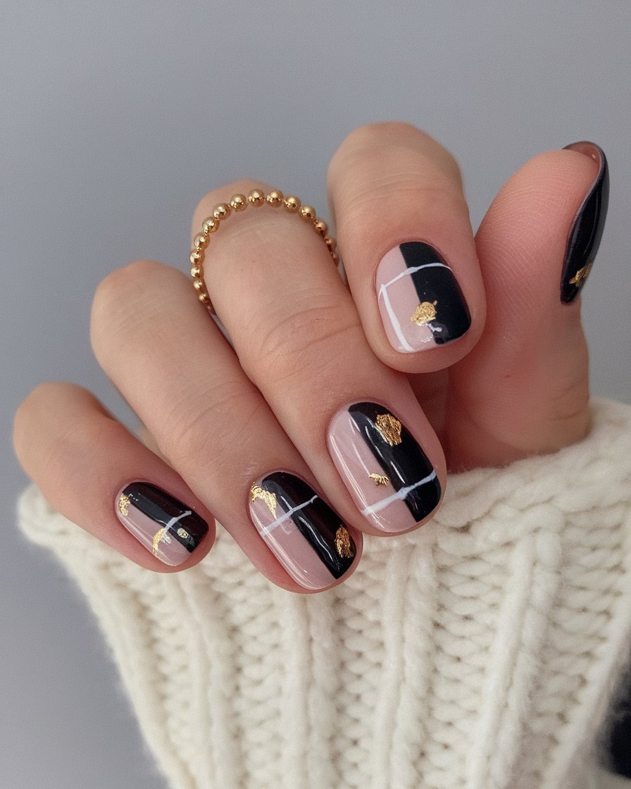 It is a plaid manicure just like your black-and-beige winter coat that is now nail-articed and made timeless with a gold sprinkling. The clean lines, the minute flakes of metallic colour add the right amount of detail to avoid an impression of over-direction.