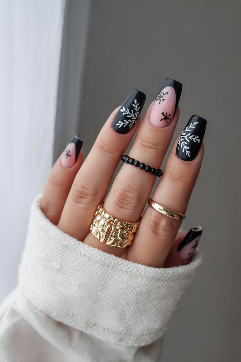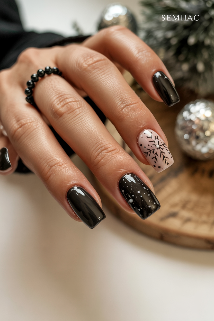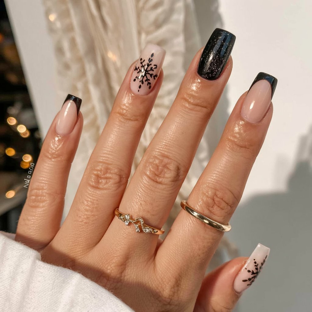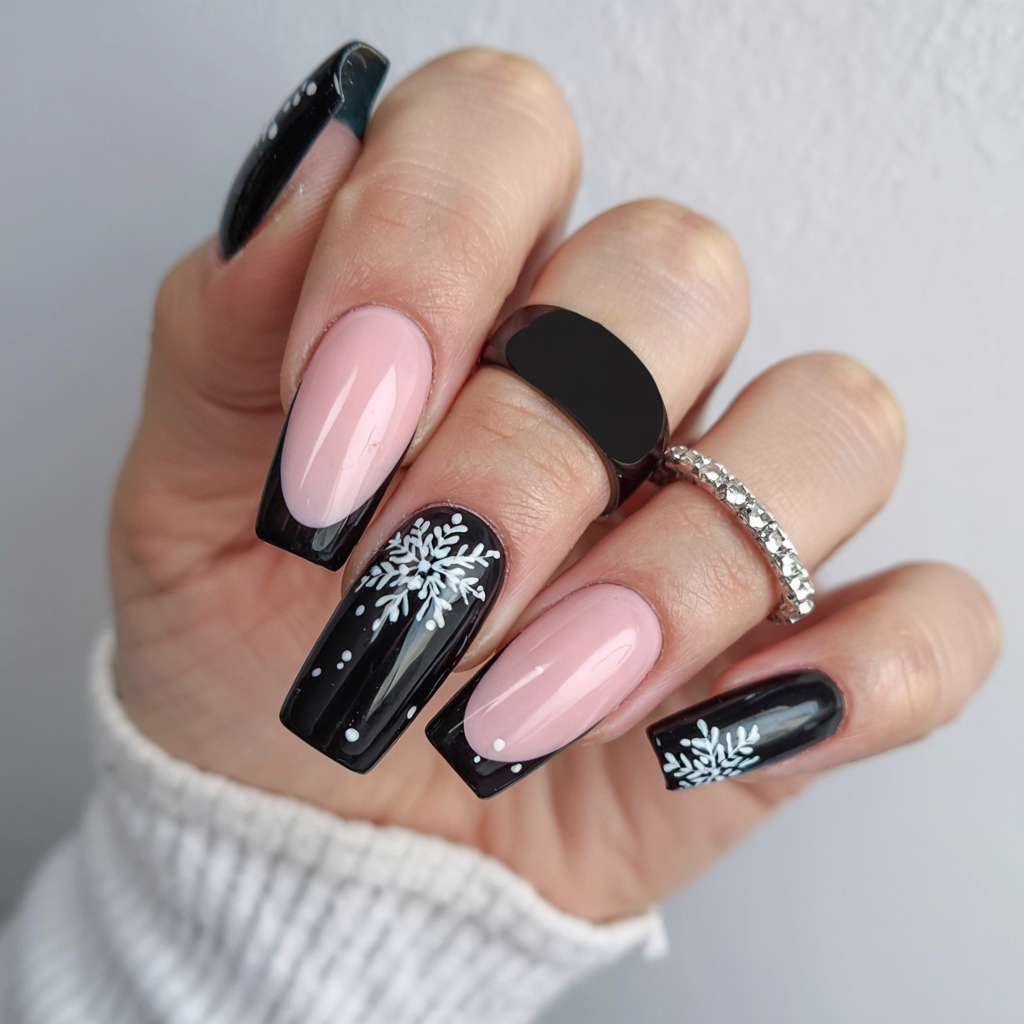 Sometimes all it takes is one small detail to make a big impact. Pairing sleek black French tips with a single snowflake accent nail, the look remains festive yet stripped down. The combo of glossy black and soft nude is timeless, while the snowflake gives a subtle hint of holiday spirit.