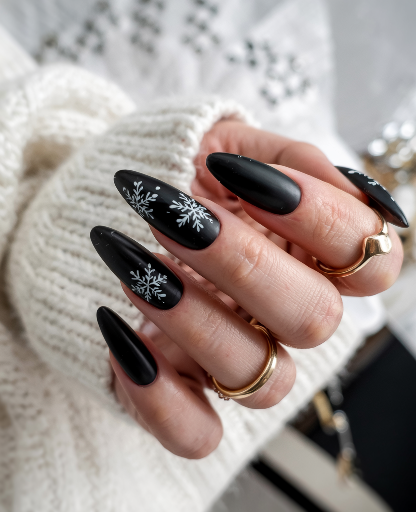 1. Black Stiletto Nails with Winter Snowflakes