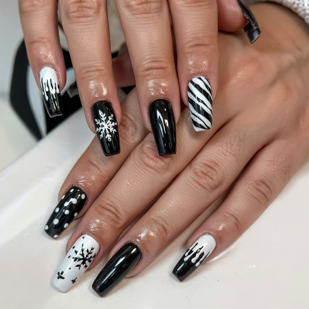 Glitter, snowflakes, and glossy black: everything a set needs to make my nails the center of attention this season. The alternating patterns add fun and liveliness, with some nails sparkling and others proud of their delicate winter snowflake artwork. It is bold, festive, and ready to party.