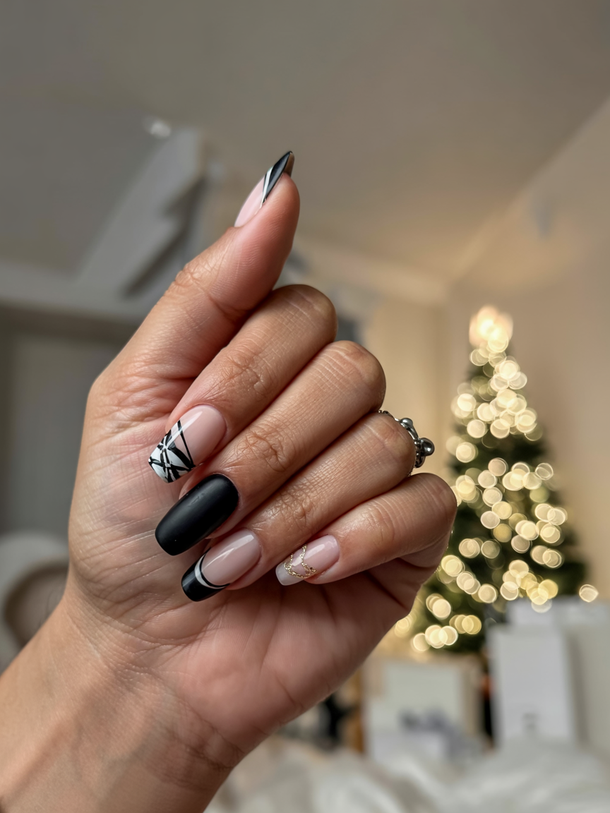 This set would be like the little black dress of holiday manicures: slick, versatile, and never going out of style. The combination of glossy black with nude bases and gold accents carved in sharp black lines is very modern with a fair nod to the festive season. Each nail tells its story: one lived wrapped in crisscross art, another glowed with a whisper of sparkle. It’s the epitome of understated holiday glam.