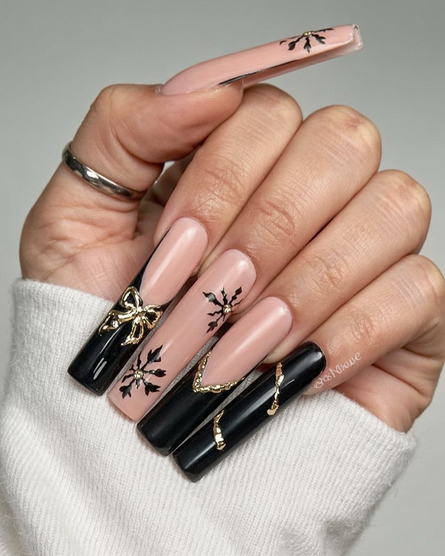 These nails definitely look prepared for a glamorous winter soirée. The glossy black and soft nude make it instantly elegant, while the gold bows and metallic accents bring on a luxurious and festive feeling. Each nail has its personality, from tiny snowflake-inspired art all the way to ribbon-like gold accents, yet still feels cohesive and polished.