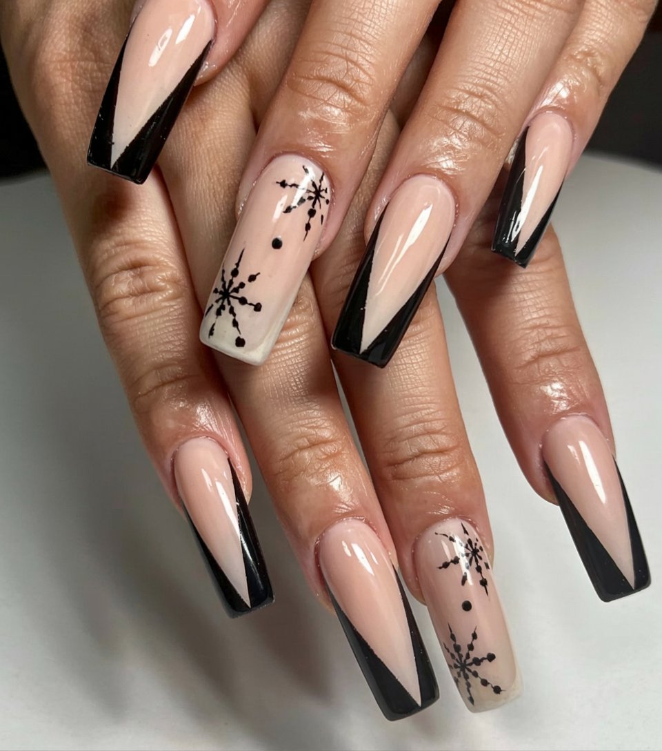 Classic with a twist, this black-tipped French set adds just the right touch of holiday charm. The crisp V-shaped tips are sleek and bold, while the tiny snowflakes on nude nails give a nod to winter without overwhelming the look. It’s polished, elegant, and perfectly in line with 2025 trends.