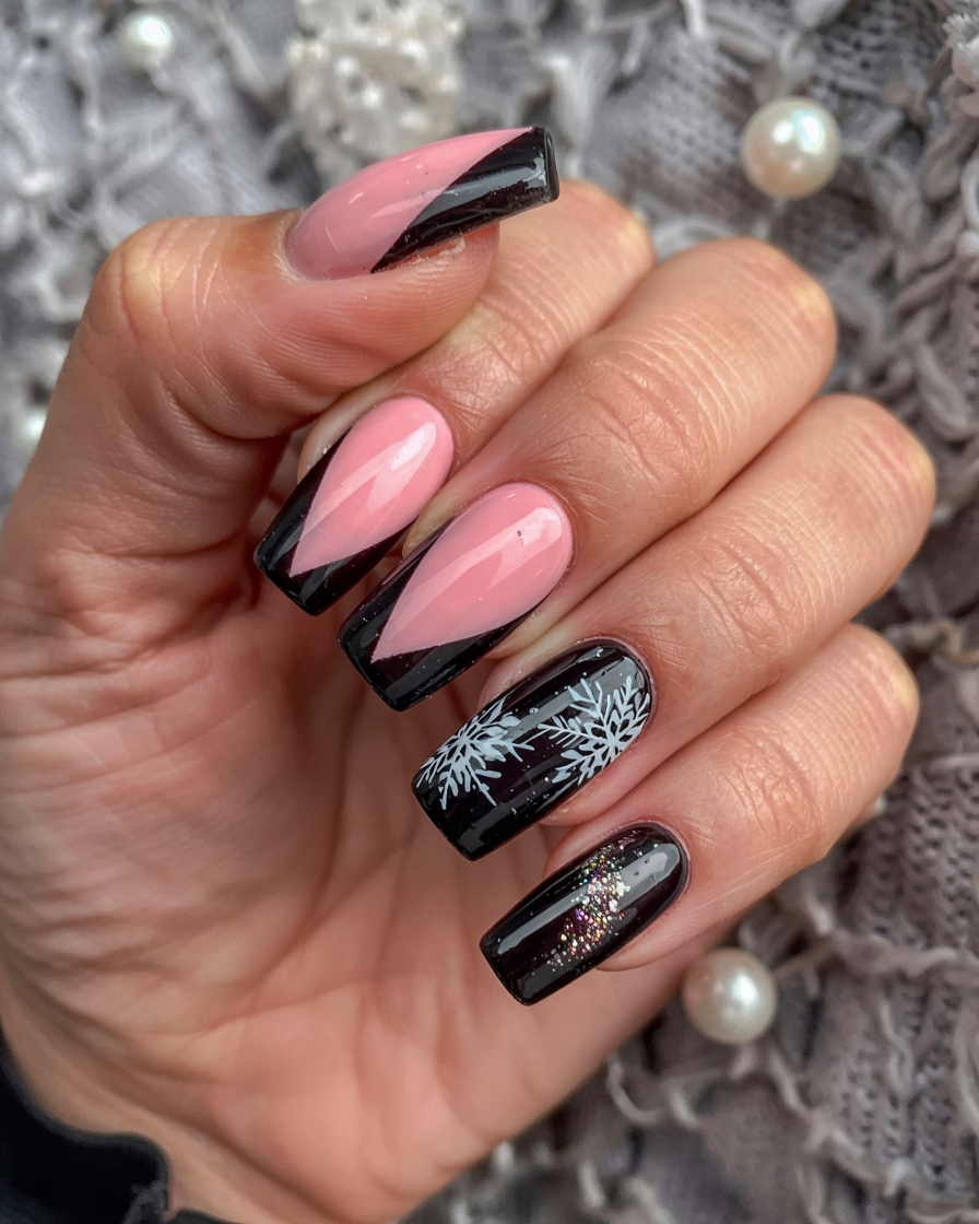 2. Black and Pink Square Nails with Snowflake Art