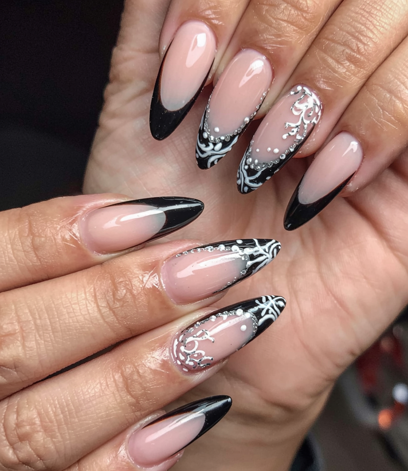15. Black French with Ornate White Holiday Art