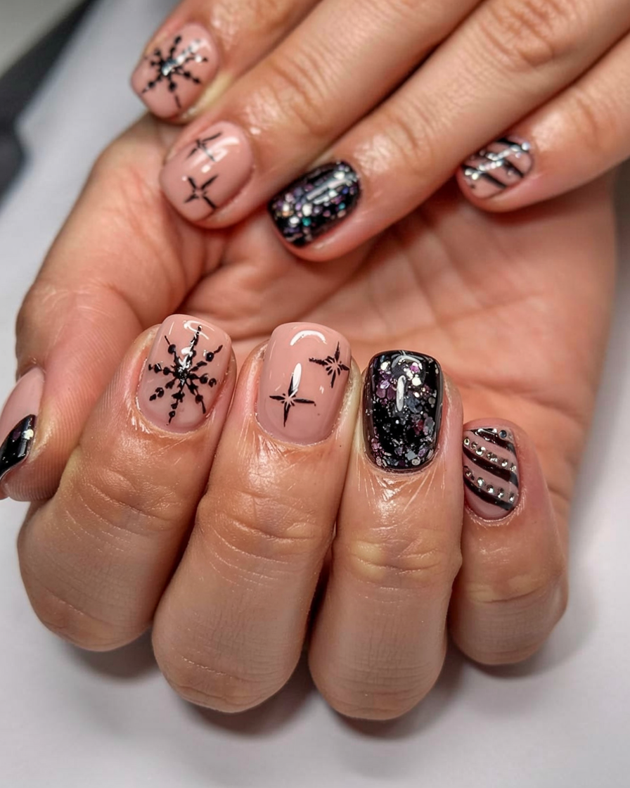 20. Black Glitter Snowflake Nails
