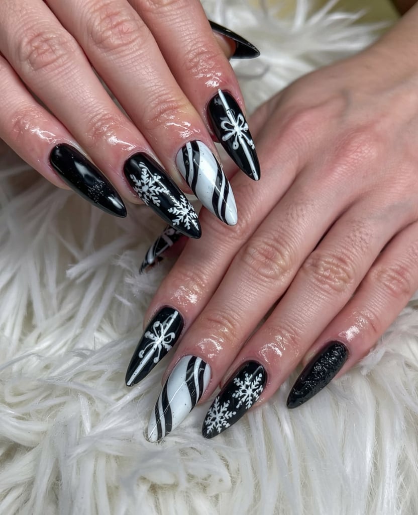 This almond set feels like a winter night sky dotted with stars. The combination of glossy black, pale pink, and delicate snowflake art keeps things elegant yet whimsical. The shimmer on the black nail looks like December lights twinkling, while the starburst details bring a refreshing holiday twist. It’s magical, feminine, and perfectly festive.