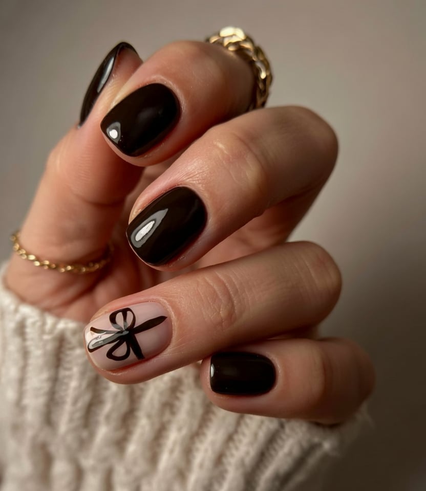 11. Short Black Nails with Gift Bow Accent