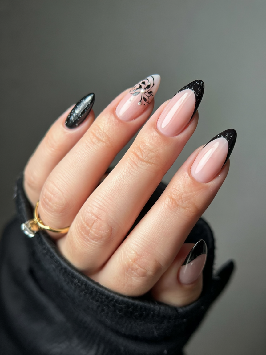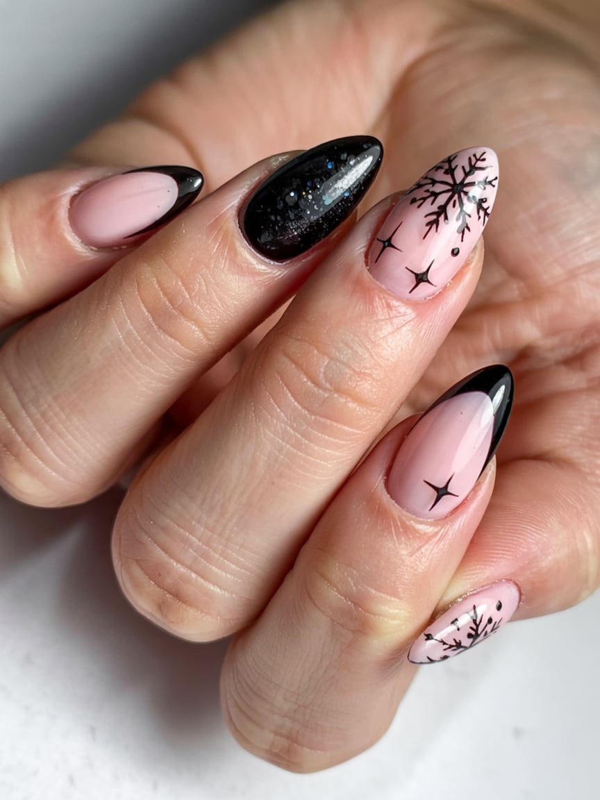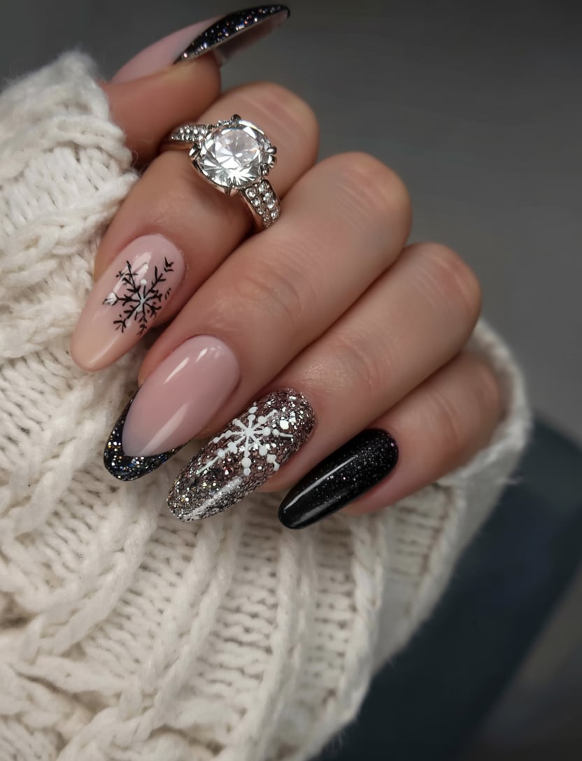 This look adds a romantic twist to the classic French manicure. Instead of plain white, the tips of those almond-shaped nails have been painted black with a hint of shimmer, creating a chic winter almond vibe. The tiny snowflake on one nail ties in the seasonal theme, while the glossy nude base ensures it remains soft and elegant.