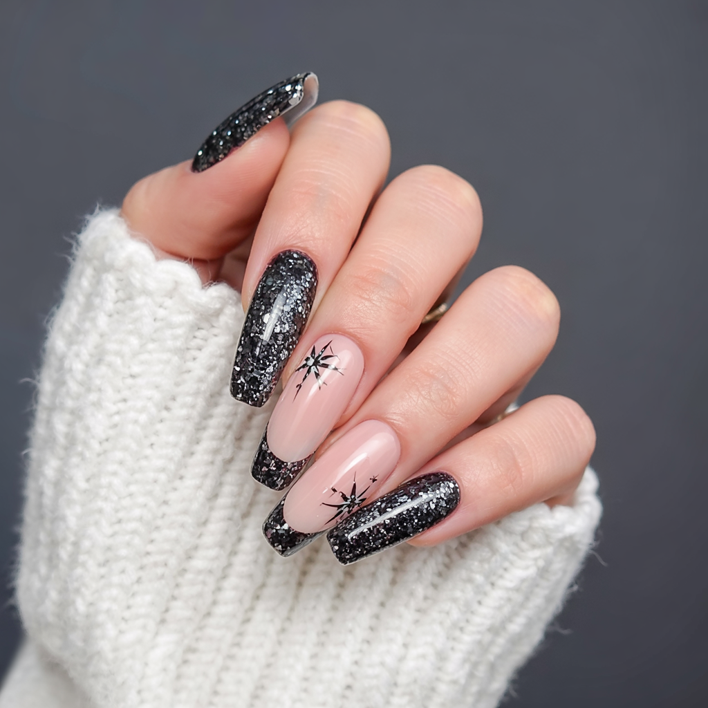 These nails glisten like a cold and frozen night sky. With black glitter French tips over nude bases and fine starburst accents, the design is festive yet subtle. It is the kind of set that will look magical while holding onto a glass of champagne at a holiday party — understated but unforgettable.
