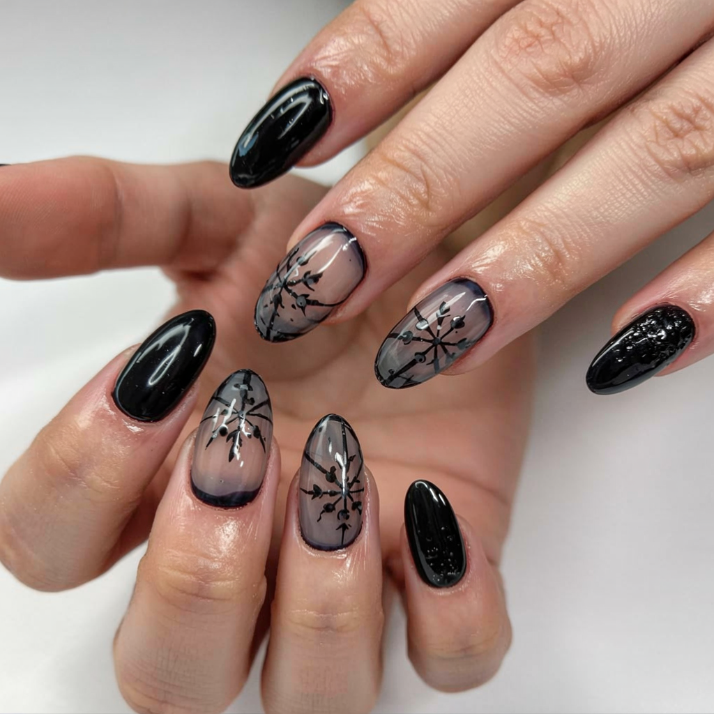 22. Sheer Black Almond Nails with Snowflake Art