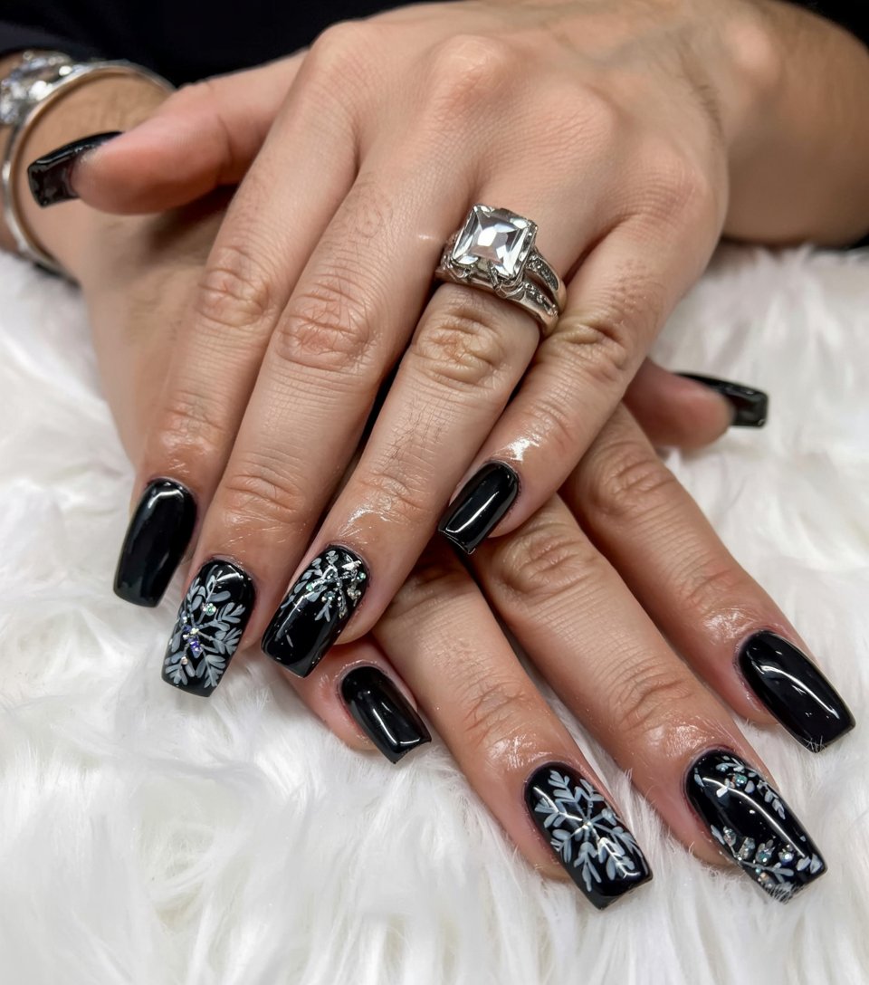 10. Glossy Black Nails with Rhinestone Snowflakes