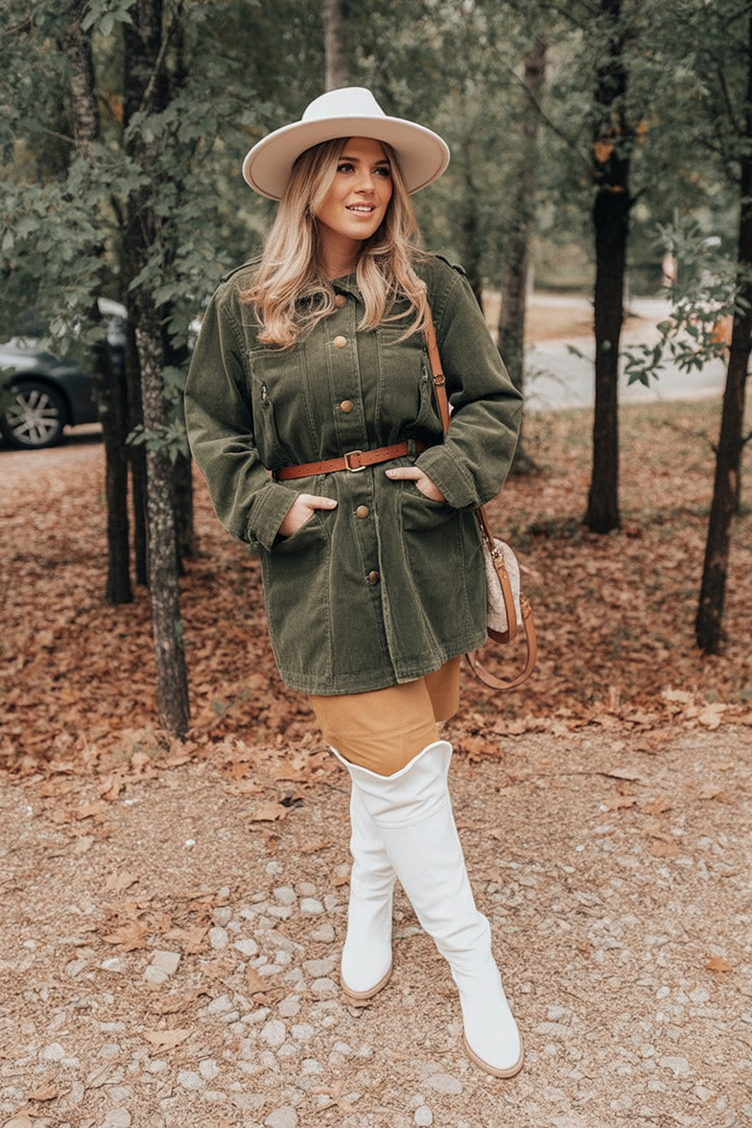 3. Olive Utility Jacket with Belted Dress and White Boots