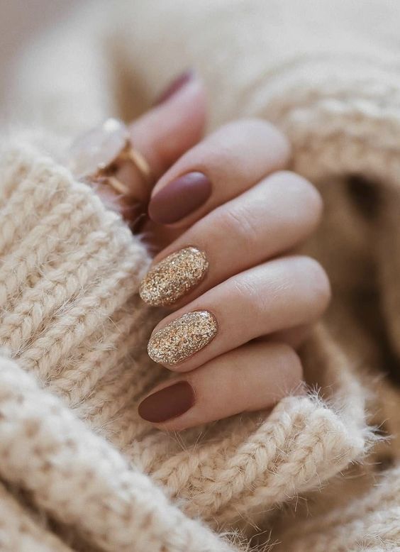 The first design features a combination of matte and glitter finishes in rich chocolate and gold tones. The contrast between the matte brown and sparkling gold creates an elegant yet festive look, perfect for any autumn occasion. This autumn gel polish design is ideal for those who love a bit of sparkle in their life.