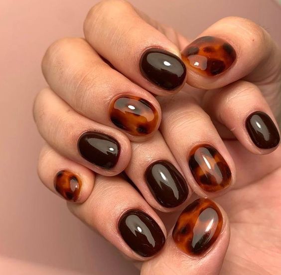 This unique tortoiseshell design combines various shades of brown and amber to create a rich, textured look. The glossy finish adds depth and sophistication, making it a standout choice for fall. It’s a chic way to incorporate dark tones and autumn designs into your nail art.