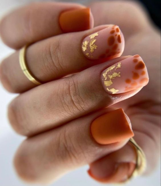 This stunning design features a matte burnt orange base with gold foil accents. The combination of the warm orange and shimmering gold creates a luxurious and festive feel. It’s a perfect example of autumn gel polish with glitter elements.