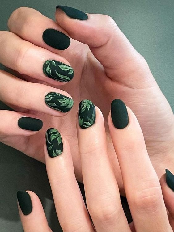 Matte forest green nails with delicate leaf designs capture the essence of autumn foliage. This gel polish design is both sophisticated and nature-inspired, making it a beautiful choice for fall. The dark green tones are perfect for those who prefer subtle yet stylish nail art.