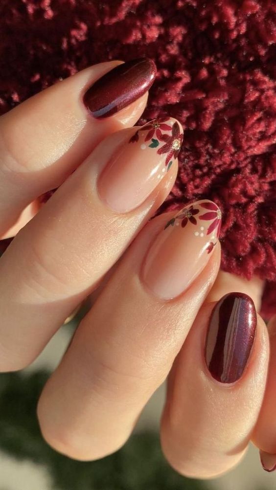 This design features a combination of burgundy and nude nails with delicate floral accents. The burgundy shade adds a rich, deep color, while the floral designs on the nude base provide a cute and artistic touch. It’s an elegant choice for simple yet beautiful autumn designs.