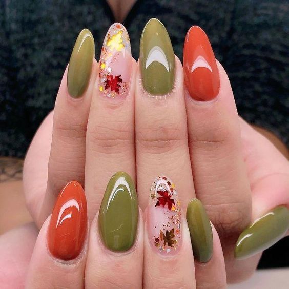 Celebrate the beauty of fall leaves with this vibrant nail design. Featuring olive green and burnt orange nails with glitter and leaf accents, this acrylic design is perfect for those who love bold and festive nail art. The gel polish finish adds a glossy and luxurious touch.