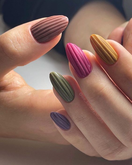 This unique design incorporates a ribbed texture in various fall colors, including burgundy, olive green, mustard yellow, and deep plum. The acrylic short nails provide a tactile and visually interesting look that’s perfect for autumn. It’s a creative way to explore different polish shades.