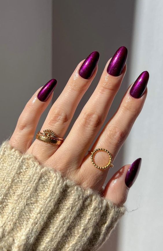 This regal plum manicure exudes luxury and sophistication. The deep, rich color combined with a glossy, almost metallic shine makes this gel polish design a showstopper. It’s perfect for autumn evenings when you want your nails to make a bold statement.