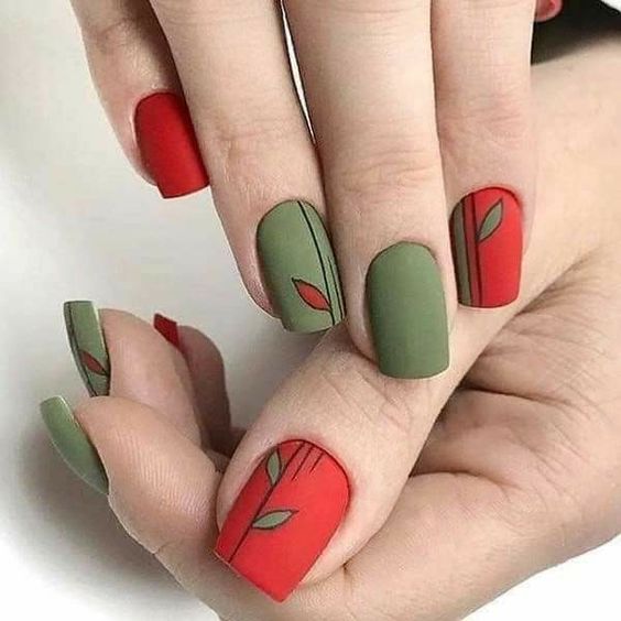 Get into the festive spirit with this unique green and red design. The matte finish and leaf patterns add an artistic touch, making this manicure stand out. It’s a cute and creative way to celebrate the season’s colors.