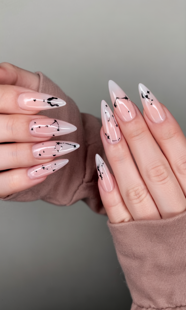 These nails are like wearing the night sky. Clear stilettos with use of minimalist constellations painted in tips can be a clue of mystery and a lot of elegance. They feel clean, chic, and full of quiet charm.