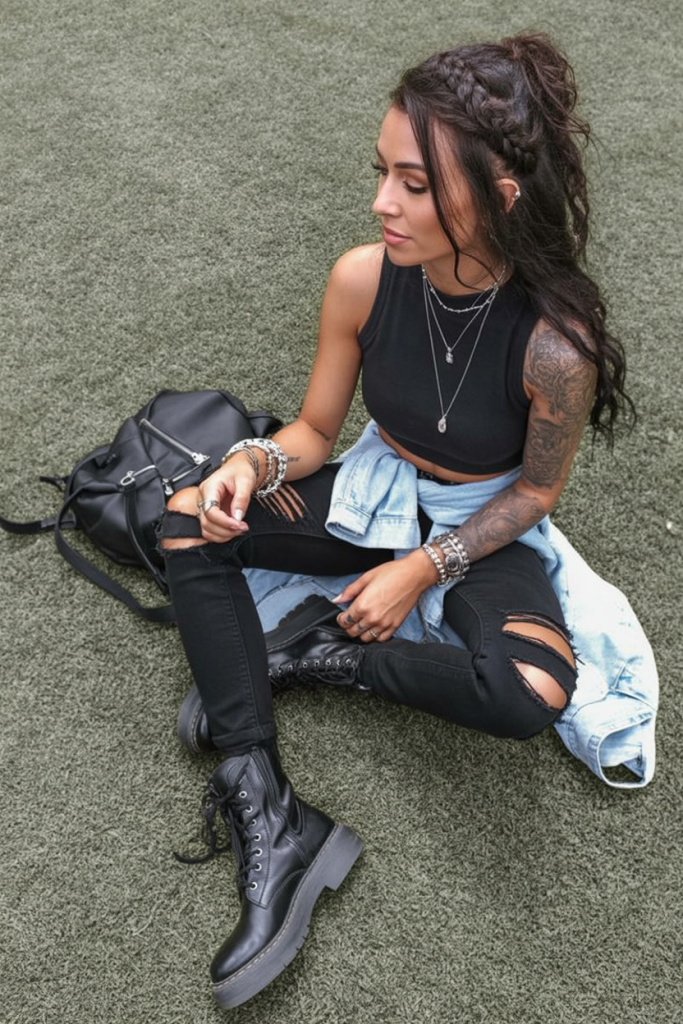 The vibe or attitude: Confident, bold, and ready for action. This outfit fits women who appreciate no-nonsense cool energy, whether they’re in an EDM crowd or at a country music festival with friends.