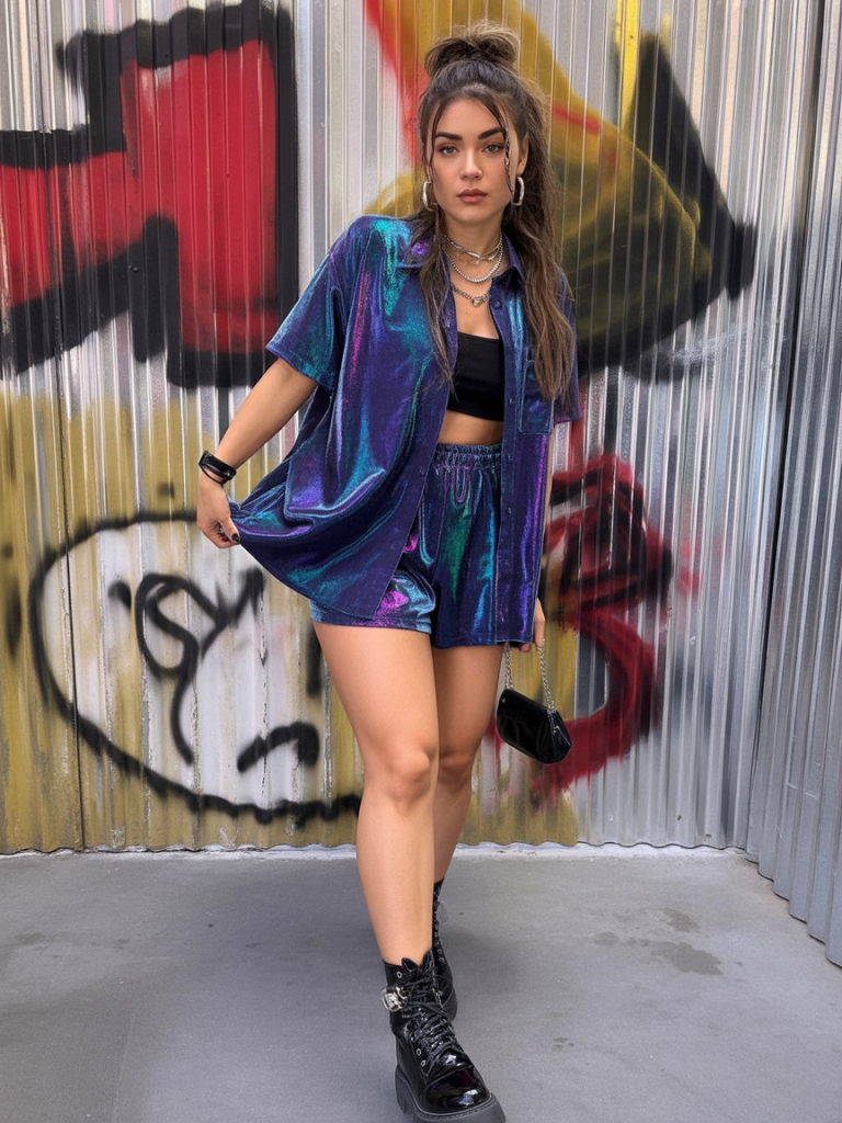 What makes this outfit special: It’s the perfect blend of futuristic glam and carefree fun. The chunky white boots add grounded cool energy, and the reflective textures catch every flash of sunset. Ideal for women who want inspiration to dress loud and joyful without sacrificing comfort.