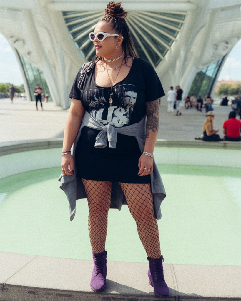 This look radiates edgy confidence with its graphic tee dress, bold accessories, and those standout purple boots. The fishnet tights add texture, while the white sunglasses give a fun retro twist. It’s a festival outfit for 2026 that says you’re here to enjoy every moment—comfortably, stylishly, and with attitude.