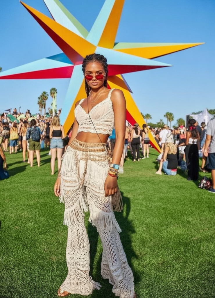 This cream crochet set feels like pure Boho magic—soft textures, breezy movement, and that handmade charm everyone loves at summer festivals. The fringe details sway with every step, turning the whole outfit into a floating dream under the sun. It’s feminine, earthy, and beautifully aligned with festival outfit 2026 trends.