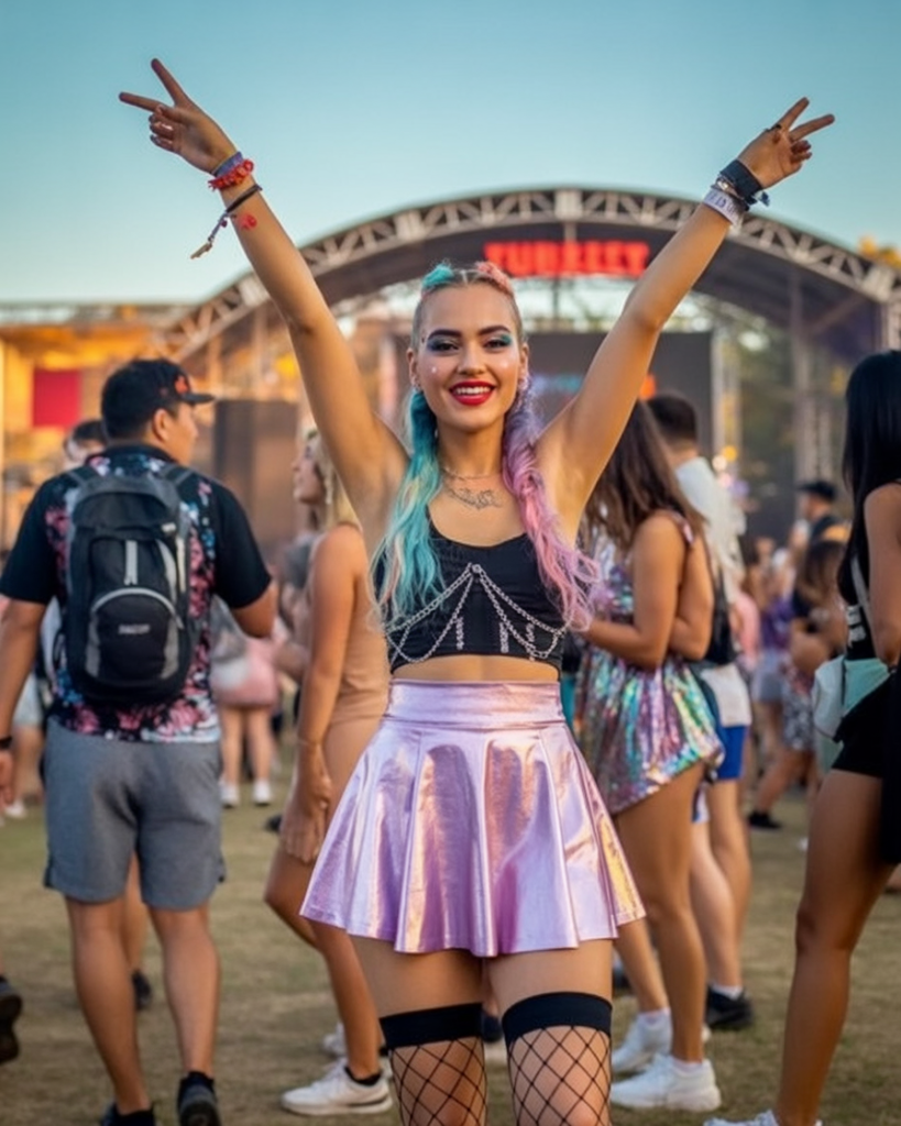 This is the festival outfit for 2026 that screams pure fun—bright, fearless, and ready for every beat drop. The metallic skirt catches the sun like a disco ball, while the playful two-tone ponytails bring that dreamy EDM energy. It’s the look of someone who came to celebrate every second and refuses to tone down her sparkle.