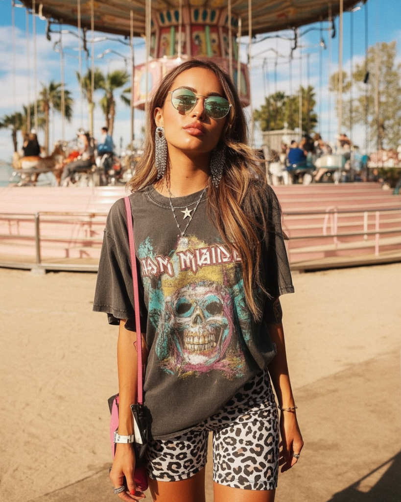 This outfit hits that perfect mix of rock attitude and playful energy. The oversized band tee gives off that “cool without trying” vibe, while the leopard biker shorts bring a spicy contrast. The oversized earrings and mirrored sunnies turn the whole look into a statement.