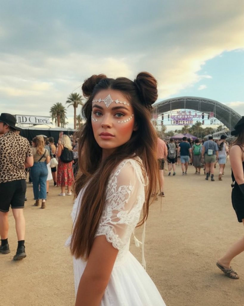 This angelic white dress paired with playful space buns creates a look that’s whimsical yet grounded. The lace sleeves add romance, while the hair gives off a fun, youthful twist. It’s the kind of outfit that feels right at sunset when the sky glows and the music softens.