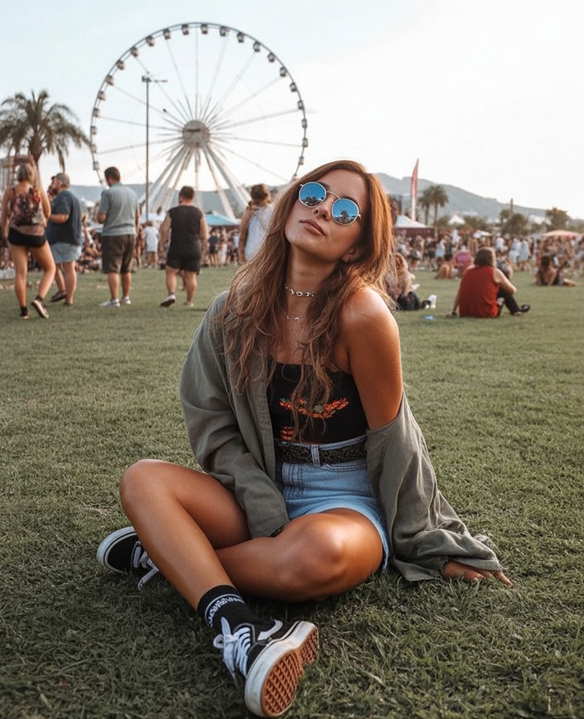 What to wear it with: A statement ring, glossy lips, and a tiny backpack keep the outfit balanced and functional. Sneakers or chunky boots both work depending on whether you’re hitting a music stage or wandering a beach-themed area.