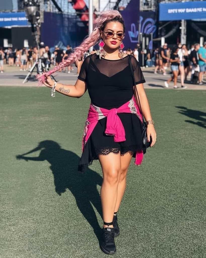 This look mixes softness and edge in the most delicious way. The sheer black top hints at drama, while the lace hem adds a feminine touch that feels perfect for warm festival nights. The pop of bright pink tied at the waist adds playful contrast, making the whole outfit feel alive and full of personality.