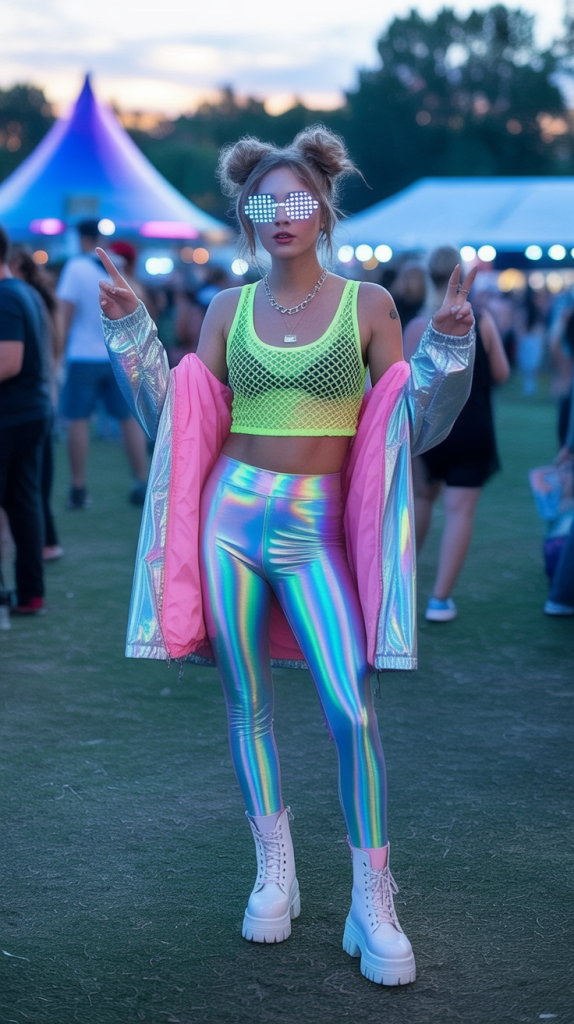 This look is pure festival electricity—bold, bright, and absolutely unbothered. The neon mesh top radiates summer confidence, while the holographic leggings shimmer like you’re carrying your own personal light show. It has that playful EDM sparkle that makes you feel unstoppable, the kind of festival outfit for 2026 that turns a casual stroll between stages into a moment of self-celebration.
