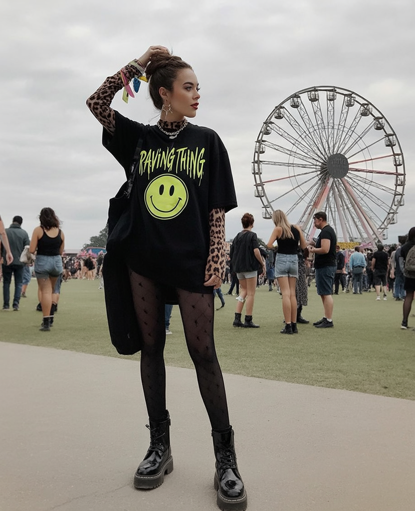 There’s something irresistible about a bold tee that instantly sets the mood. This oversized graphic top—paired with leopard-print sleeves and star-pattern tights—gives off that cool-girl-who-knows-every-lyric energy. It’s effortless, edgy, and perfect for long festival days where comfort matters just as much as attitude.