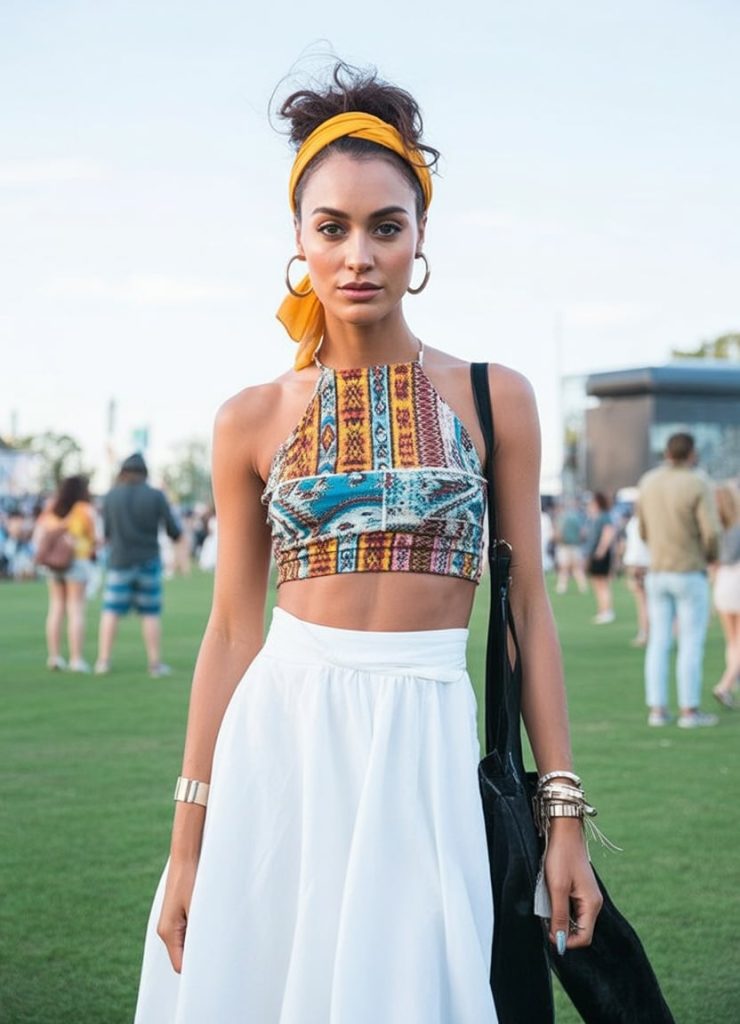 This outfit brings pure sunshine energy with its vibrant boho crop top and soft, flowing skirt. It feels feminine, bold, and joyfully expressive—the kind of look that turns a simple day at a festival into an inspirational moment. The golden headwrap highlights the face beautifully, creating that irresistible glow you only get at beach or country music events.