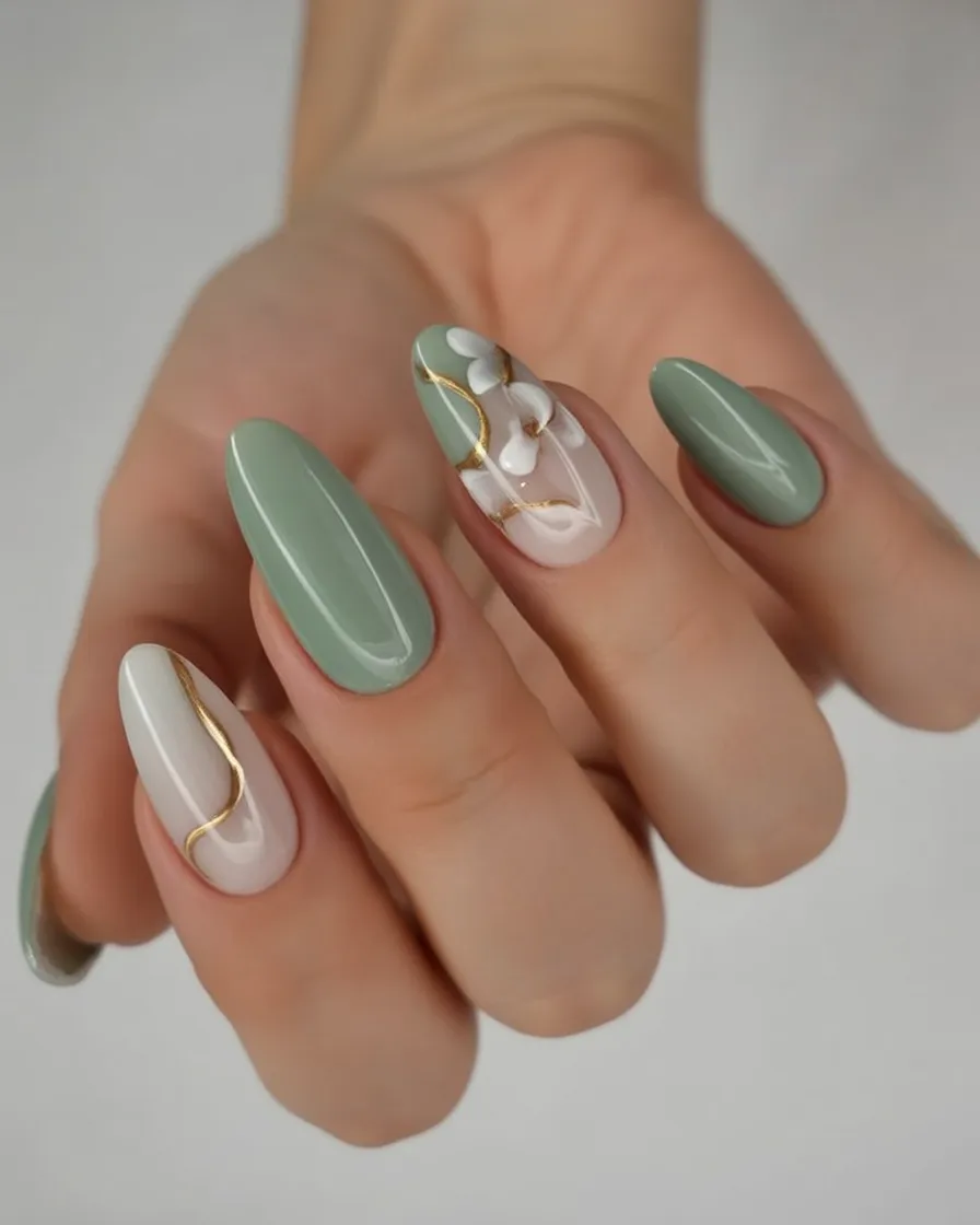 This manicure feels calm, grounded, and quietly luxurious. The muted sage green instantly gives a sense of balance, while the soft white base and flowing gold lines add an artistic, almost meditative touch. It’s the kind of nail look that feels intentional and thoughtful—perfect for someone who loves understated beauty with depth. There’s a natural elegance here that fits beautifully into early spring, when everything feels fresh but not loud yet.