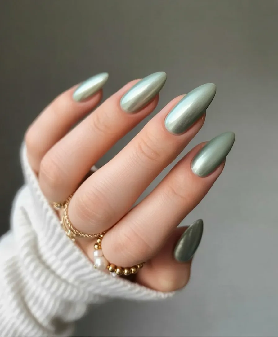 This metallic sage finish feels calm, modern, and quietly luxurious. The soft sheen catches the light without being flashy, giving the nails a polished, almost editorial look. It’s understated glamour at its best—cool, clean, and confident.