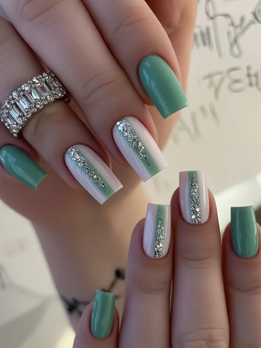 This manicure feels clean, modern, and quietly festive. The soft green polish paired with crisp white nails creates a fresh contrast, while the vertical glitter stripe adds just enough sparkle to elevate the look. It’s polished without being flashy, making it feel confident and well put together. There’s a calm elegance here that works beautifully for early spring, when you want something fresh but still grounded.