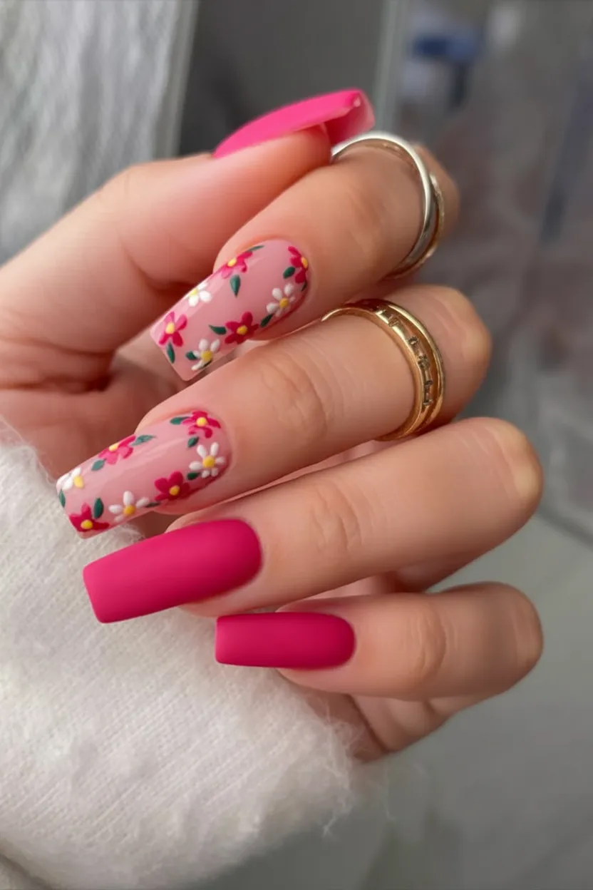 This manicure feels romantic, feminine, and full of charm. The soft pink base paired with detailed floral art creates a look that feels thoughtful and beautifully styled. It’s sweet without being overpowering and instantly gives that polished spring-ready feeling.