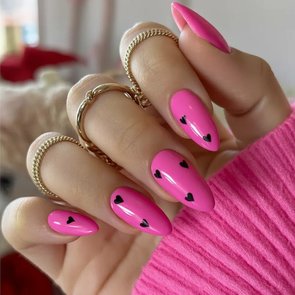 Bold, playful, and unapologetically fun—these nails bring instant mood-lift energy. The bright pink base paired with tiny black hearts feels flirty but confident, like wearing your favorite statement lipstick just because you feel like it.