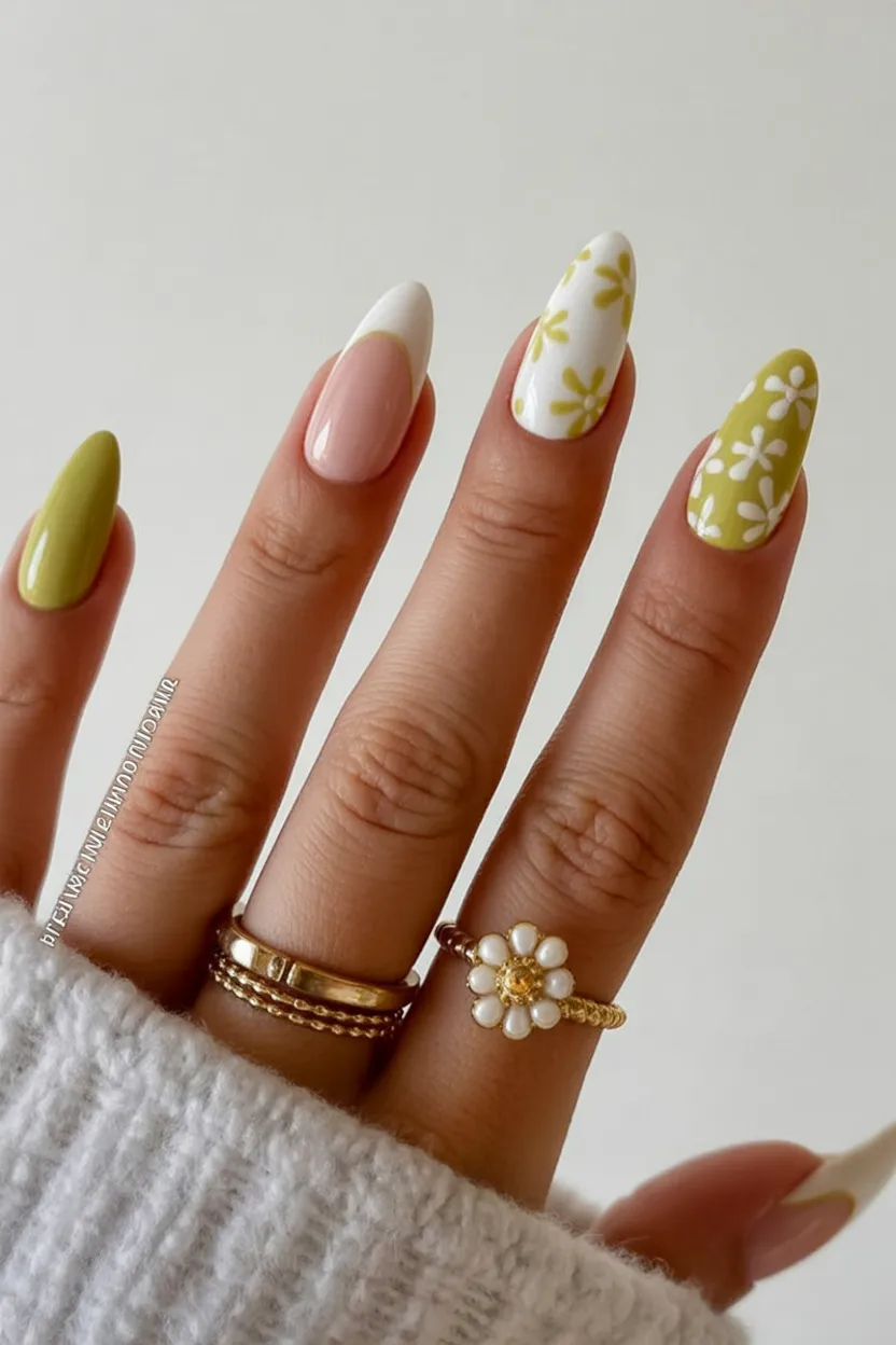 These nails feel cozy, cheerful, and approachable. The soft green tones paired with tiny floral elements create a warm, friendly look that feels effortless. It’s the kind of manicure that fits right into daily life while still feeling styled and intentional.