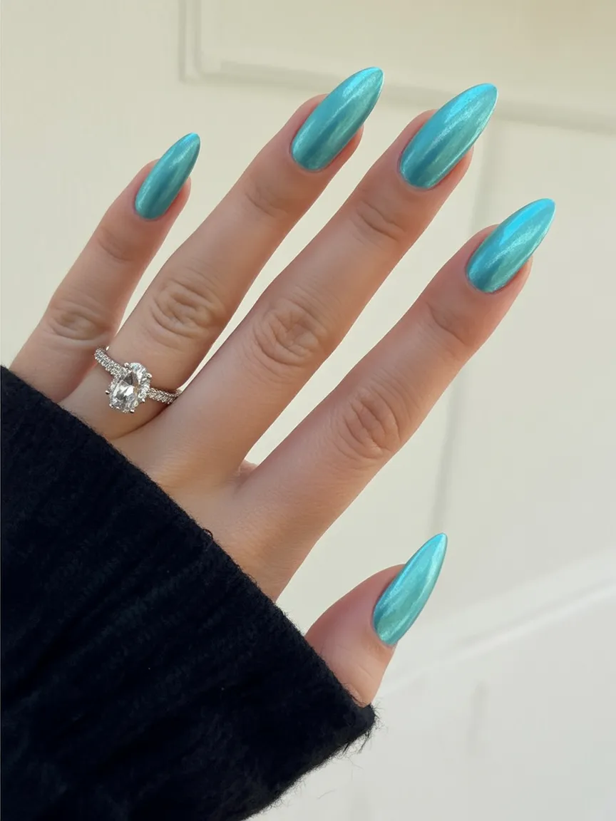 These nails feel bold, fresh, and energizing. The metallic turquoise shade catches the light beautifully, giving the manicure a luminous, almost ocean-inspired glow. It’s vibrant without feeling overpowering—confident, playful, and impossible to ignore. This is the kind of color that instantly lifts your mood and makes your hands feel like a statement accessory.