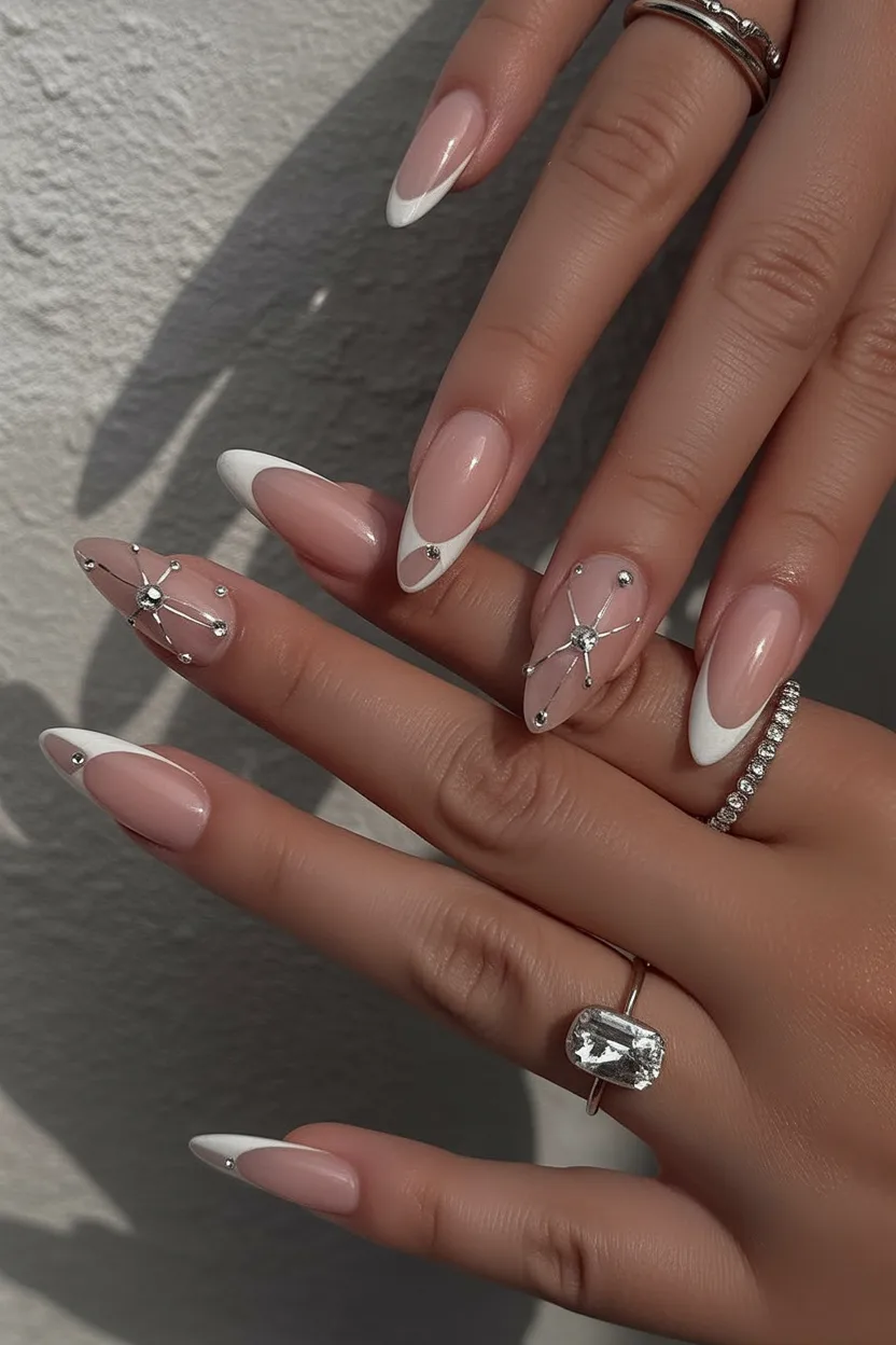 There’s something effortlessly chic about this modern French manicure. The soft nude base keeps things clean and timeless, while the crisp white tips feel fresh and polished. What really makes this set special are the tiny crystal star accents—they add just enough sparkle to feel playful without crossing into flashy territory. It’s elegant, feminine, and quietly eye-catching.